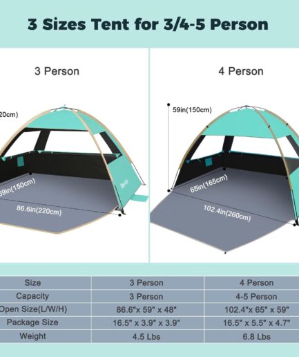 Beach Tent Sun Shelter for 3/4-5/6-7/8-10 Person, 50+ UV Protection Beach Canopy, Lightweight and Easy Setup Cabana, Portable Beach Shade Tent